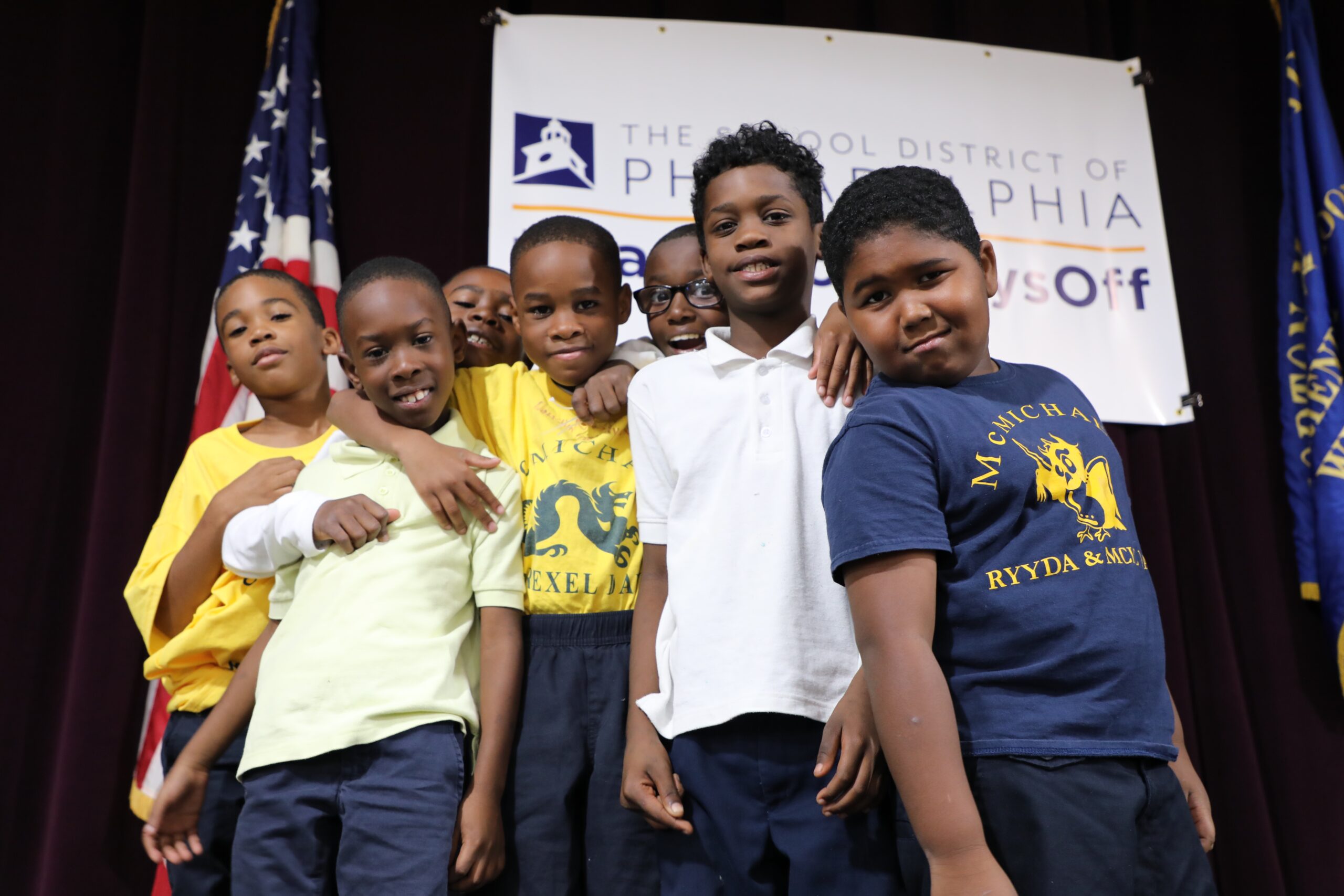 Group of young students posing in front of the American flag