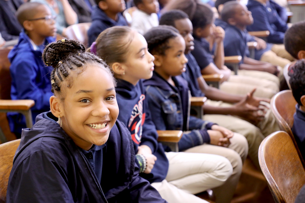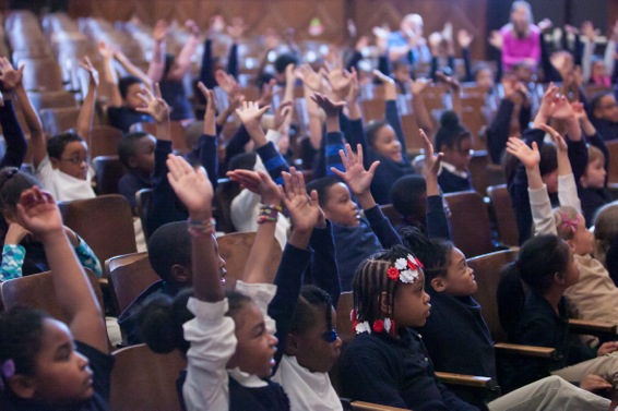 Students in auditorium with hands raised