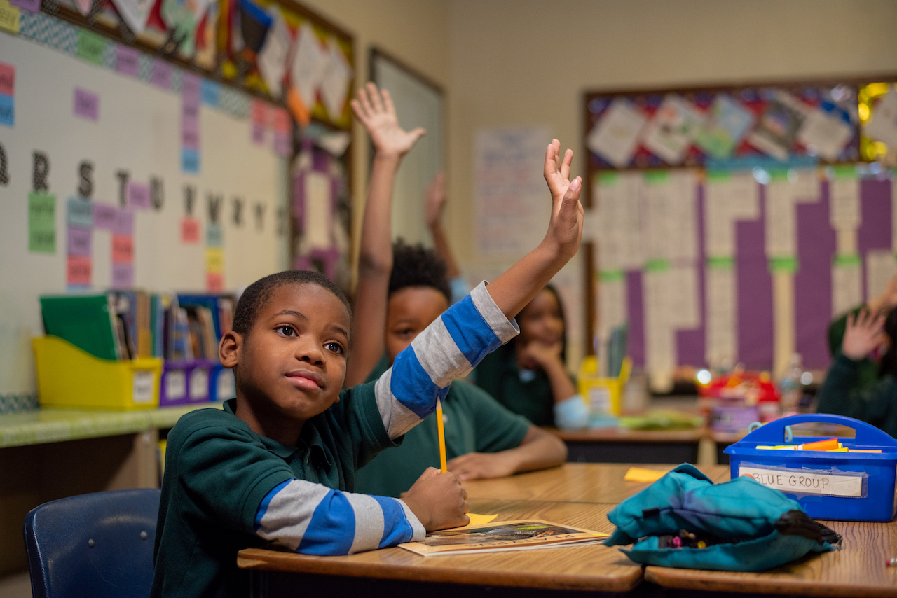 Classroom Picture of a Young Student Raising Hand